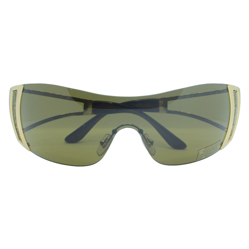 Gafa de sol de pantalla con codos en dorado y con Swarovski. Varillas dobles finas. Lente en tono verde .