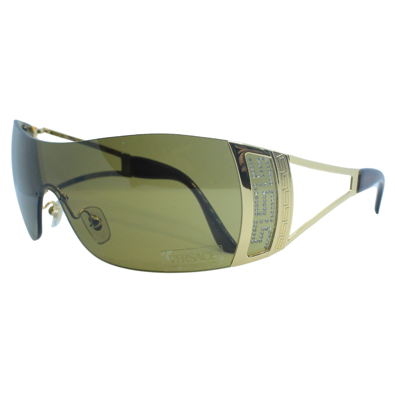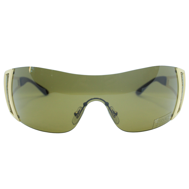 El modelo Versace es una gafa de pantalla al aire con los laterales en metal dorado con la serigrafía emblemática de la firma y con Swarovski, las lentes de polycarbonato protegiendo contra los rayos UV a lo largo de todo el día en color verde. Las varillas dobles en dorado y terminales en marrón. Es una gafa elegante de pantalla con curvatura que se adapta a cualquier rostro para completar un look más clásico.