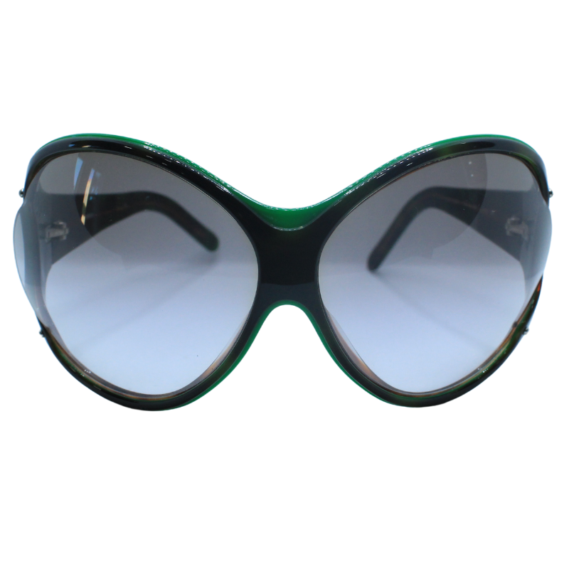 Gafa de sol en acetato con curvatura envolvente color carey y líneas verdes.